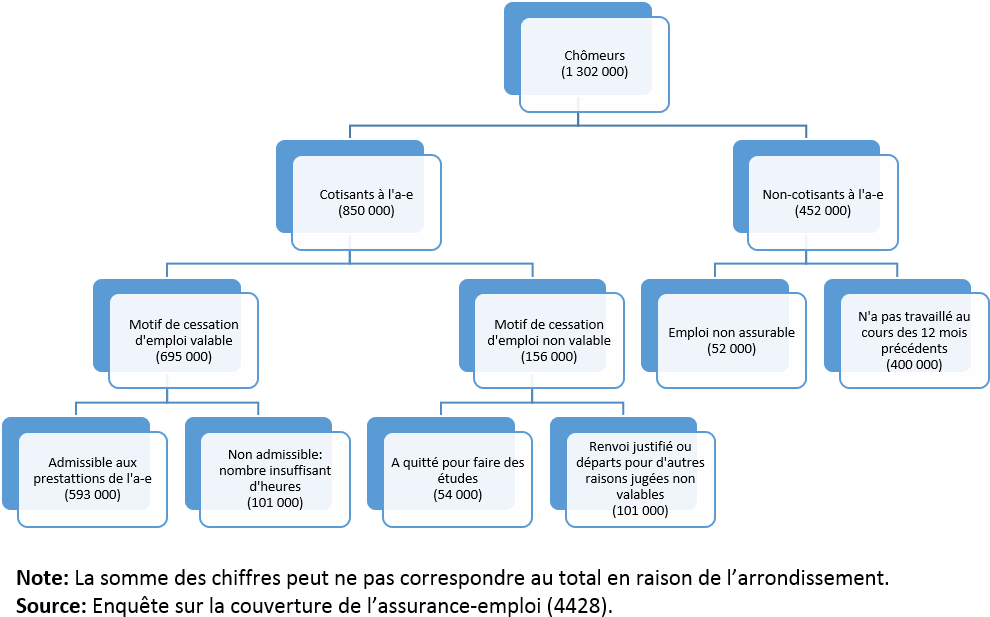 Ce diagramme présente la distribution des chômeurs en différents groupes en se basant sur les critères principaux de couverture et d'admissibilité pour recevoir des prestations d'assurance-emploi régulières.