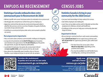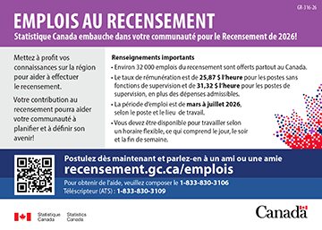 Le prochain Recensement de la population aura lieu au printemps 2026. Le recensement fournit des données de grande qualité dont votre communauté peut se servir pour aider à planifier des services qui soutiennent l'emploi, la garde d'enfants, l'éducation et les soins de santé. Statistique Canada recrute actuellement du personnel pour aider les membres des communautés à remplir leur questionnaire du recensement.