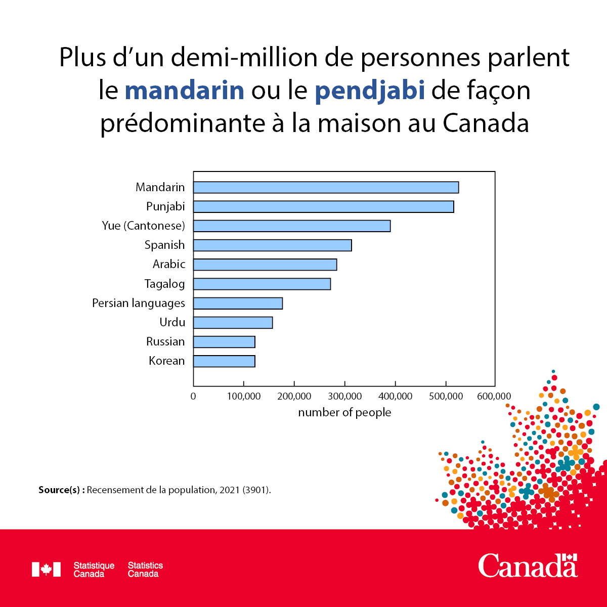 - 4,6 millions de Canadiennes et Canadiens parlent une langue autre que le français ou l'anglais de façon prédominante à la maison.