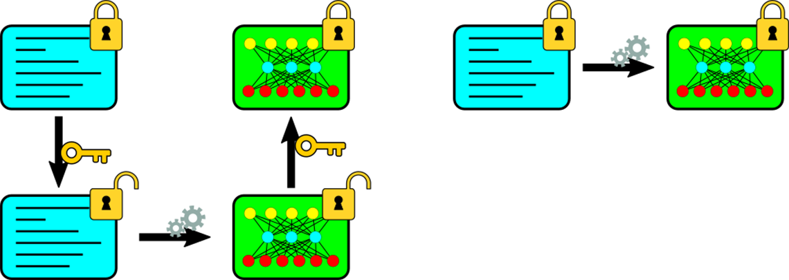Figure 1 : Illustration des avantages du chiffrement homomorphe. La série de figures de gauche représente un chiffrement ordinaire; pour appliquer l'analyse souhaitée, les données doivent d'abord être déchiffrées à l'aide de la clé privée. Pour que le transfert des résultats soit sécurisé, les données doivent être chiffrées à nouveau. Les données sont en outre vulnérables pendant toute la durée du traitement informatique. La série de figures de droite représente le chiffrement homomorphe; la partie effectuant le traitement informatique n'a besoin d'aucun renseignement de nature délicate pour procéder aux calculs, et les données ainsi que les résultats sont protégés par chiffrement.
