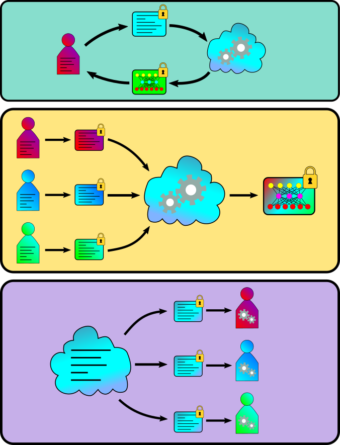 Illustrations des trois paradigmes. Dans le cadre du paradigme de traitement informatique délégué, le détenteur de données envoie ses données chiffrées au nuage, qui lui retourne les résultats chiffrés. Dans le paradigme de multiples détenteurs de données, ces derniers peuvent individuellement envoyer leurs données chiffrées, permettant au serveur infonuagique d'effectuer un traitement informatique conjoint sur l'union de leurs ensembles de données, fournissant ainsi un résultat analytique plus robuste. Dans le paradigme de « banque de données », le nuage héberge les données et peut envoyer des données chiffrées à tout analyste choisi, sans crainte d'une mauvaise utilisation des données.