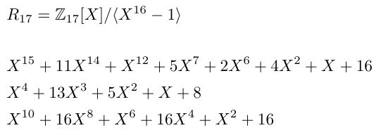 Ici, la valeur de est 17 et la valeur de est 16. Des exemples de polynômes de l'anneau sont également indiqués; un exemple est le polynôme .
