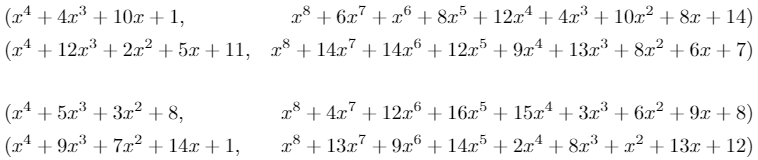 Quatre paires de polynômes. Cela est supposé être un petit exemple du problème RLWE pour que vous vous y exerciez chez vous. Les paires polynomiales sont réparties en deux groupes. Un groupe est réparti sous forme pour un « petit » polynôme s et l'autre est de la forme pour et aléatoires. Savez-vous lequel est lequel? Les polynômes de la figure sont reproduits ci-dessous :