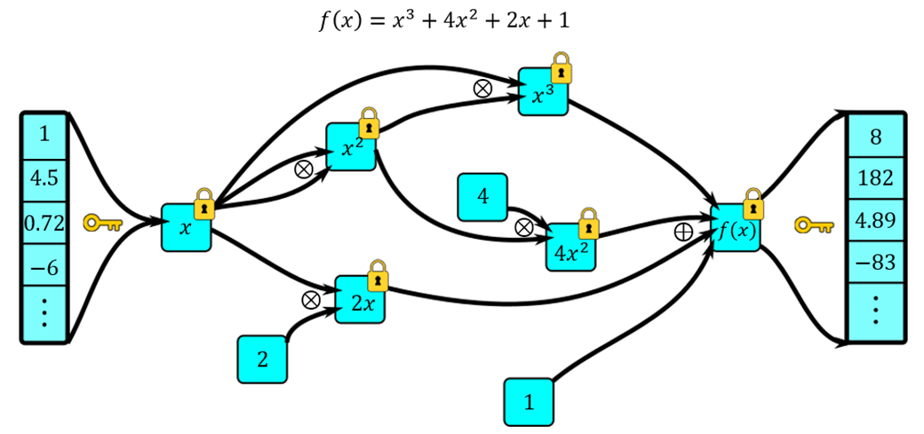 Le chiffrement homomorphe autorise en outre un ensemble limité de calculs en mode natif. Seules l'addition, la soustraction et la multiplication sont natives à la plupart des procédés arithmétiques et tous les autres calculs (exponentiels, fonctions d'activation, etc.) doivent être exprimés approximativement par un polynôme. Il convient de souligner que cela est généralement le cas avec tous les ordinateurs, mais lorsqu'un ordinateur moderne cache ce fait à l'utilisateur, les bibliothèques de chiffrements homomorphes exigent actuellement de l'utilisateur qu'il précise comment calculer ces fonctions non insignifiantes.Note de bas de page 3 Dans certains procédés, il convient également de se préoccuper de la profondeur des calculs tentés. En effet, ces procédés introduisent du bruit dans les données chiffrées pour les protéger.