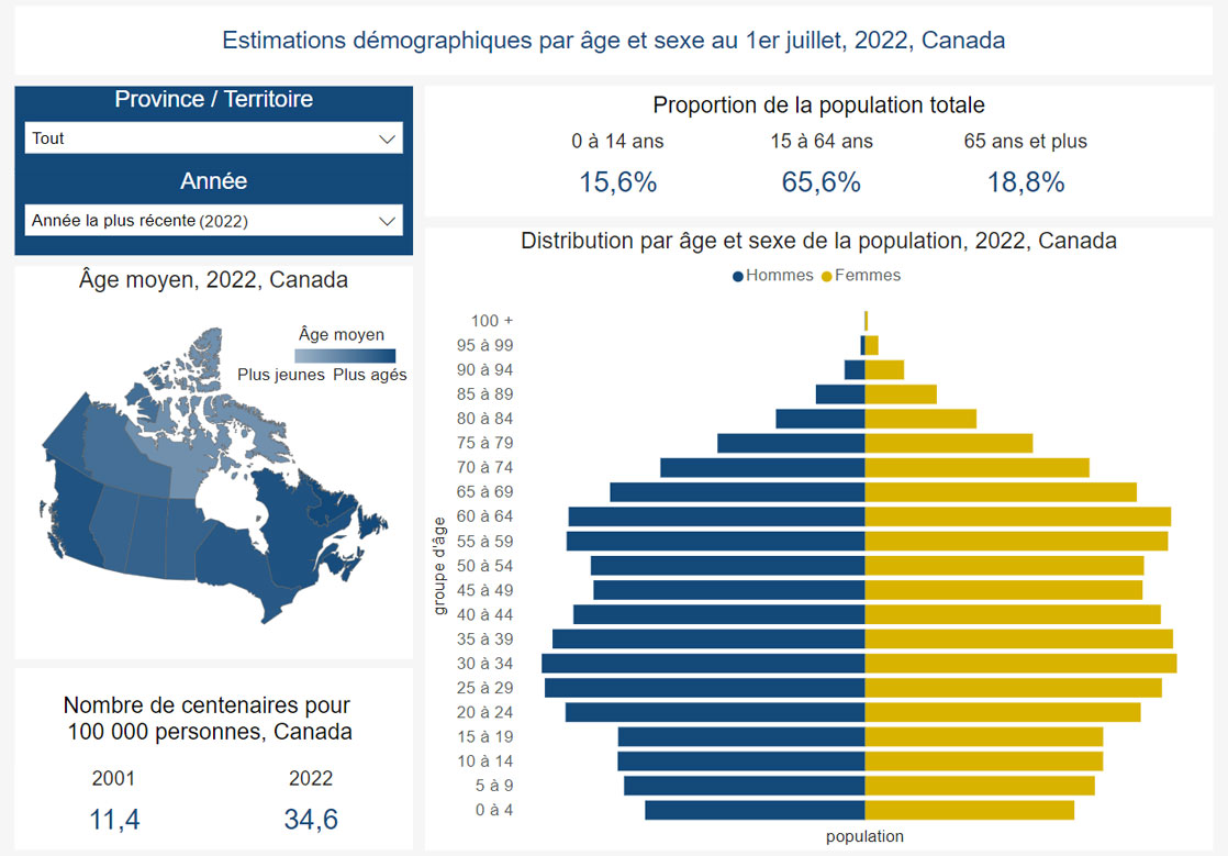 Ce tableau de bord interactif permet de visualiser la structure par âge et genre de la population du Canada, des provinces et des territoires. Les données présentées couvrent la période allant de 1971 jusqu'à l'année la plus récente. Le tableau de bord montre la proportion de la population totale par grand groupe d'âge, la proportion de centenaires, la répartition de la population par âge et genre, l'âge moyen, le nombre de personnes de 15 à 64 ans par personne de 65 ans et plus et le nombre d’hommes+ pour 100 femmes+ par groupe d'âge. Les données peuvent être visualisées pour le Canada, une province ou un territoire spécifique.