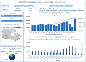Cette horloge démographique modélise en temps réel les changements dans la taille de la population du Canada, des provinces et des territoires.