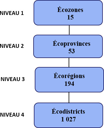 Les écozones se subdivisent en 53 écoprovinces comportant 194 écorégions, qui à leur tour se subdivisent en 1 027 unités écologiques distinctes appelées écodistricts. Cette relation est illustrée à la figure 1.