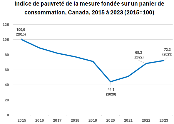 En 2023, l'indice de pauvreté fondé sur la mesure du panier de consommation était de 72,3, comparativement à 68,3 en 2022. Plus d'informations sur l'Indice de pauvreté fondé sur la mesure du panier de consommation
