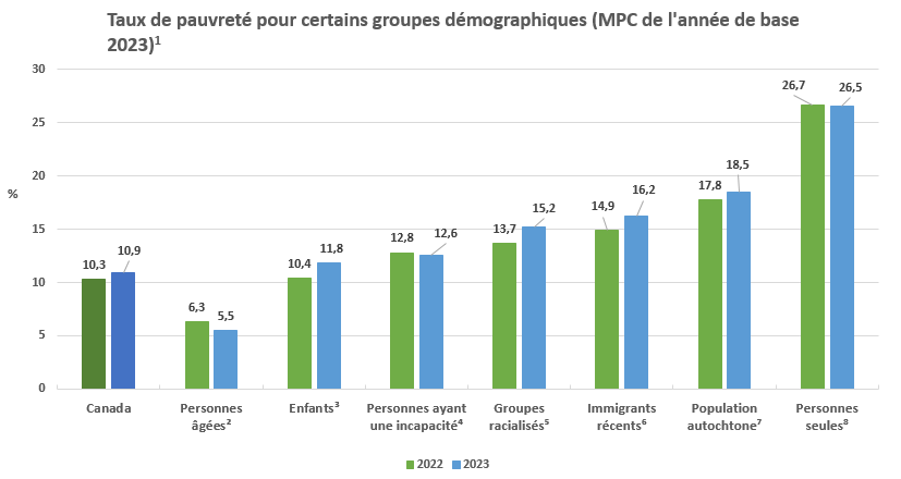 En 2023, 10,9 % des Canadiens vivaient dans la pauvreté, comparativement à 10,3 % en 2022. Plus d'informations sur le Seuil officiel de la pauvreté au Canada