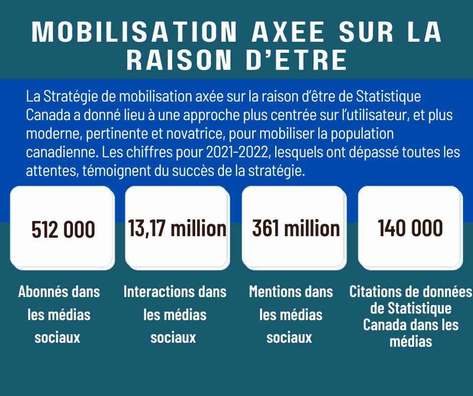 La Stratégie de mobilisation axée sur la raison d'être de Statistique Canada a donné lieu à une approche plus centrée sur l'utilisateur, et plus moderne, pertinente et novatrice, pour mobiliser la population canadienne. Les chiffres pour 2021-2022, lesquels ont dépassé toutes les attentes, témoignent du succès de la stratégie.
