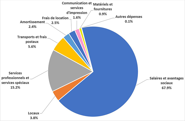 Statistique Canada a dépensé 1,1 milliard de dollars en 2021-2022. Ces dépenses comprennent 746,8 millions de dollars engagés pour les salaires et avantages sociaux du personnel (67,9 %), 42,1 millions de dollars pour les locaux (3,8 %), 166,8 millions de dollars pour les services professionnels et les services spéciaux (15,2 %), 61,5 millions de dollars pour le transport et les frais postaux (5,6 %), 26,9 millions de dollars en frais de location (2,5 %), 26,2 millions de dollars pour l'amortissement (2,4 %), 17,6 millions de dollars pour la communication et l'impression (1,6 %), 9,5 millions de dollars en matériels et fournitures (0,9 %) et 1,5 million de dollars pour les autres dépenses (0,1 %).