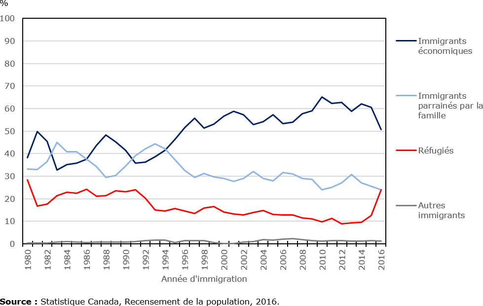 | Immigrants économiques | Immigrants parrainés par la famille | Réfugiés | Autres immigrants | |