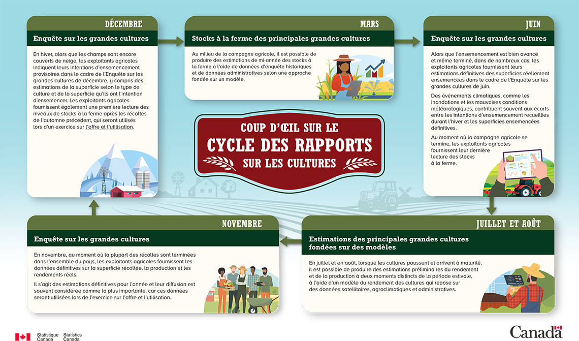 En juillet et en août, lorsque les cultures poussent et arrivent à maturité, il est possible de produire des estimations préliminaires du rendement et de la production à deux moments distincts de la période estivale, à l’aide d’un modèle du rendement des cultures qui repose sur des données satellitaires, agroclimatiques et administratives. (Dans la section de juillet et aout du graphique, on présente une image d’un agriculteur tenant un appareil numérique. Une flèche mène à la section novembre du graphique)