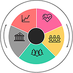 Cette image illustre le Cadre de qualité de vie pour le Canada. Il est représenté sous la forme d'un graphique circulaire avec le terme « Qualité de vie » dans un cercle en son centre. Le graphique circulaire est divisé en cinq segments qui représentent chacun des cinq domaines du cadre : Prospérité, Santé, Société, Environnement et Saine gouvernance. Chaque domaine est représenté par une icône : la prospérité par l'image d'un graphique linéaire, la santé par un cœur et une ligne électrocardiogramme, la société par un groupe de personnes, l'environnement par des arbres, et la saine gouvernance par un palais de justice. Les deux lentilles du cadre, Équité et inclusion et Durabilité et résilience, encerclent l'image avec des flèches courbes.