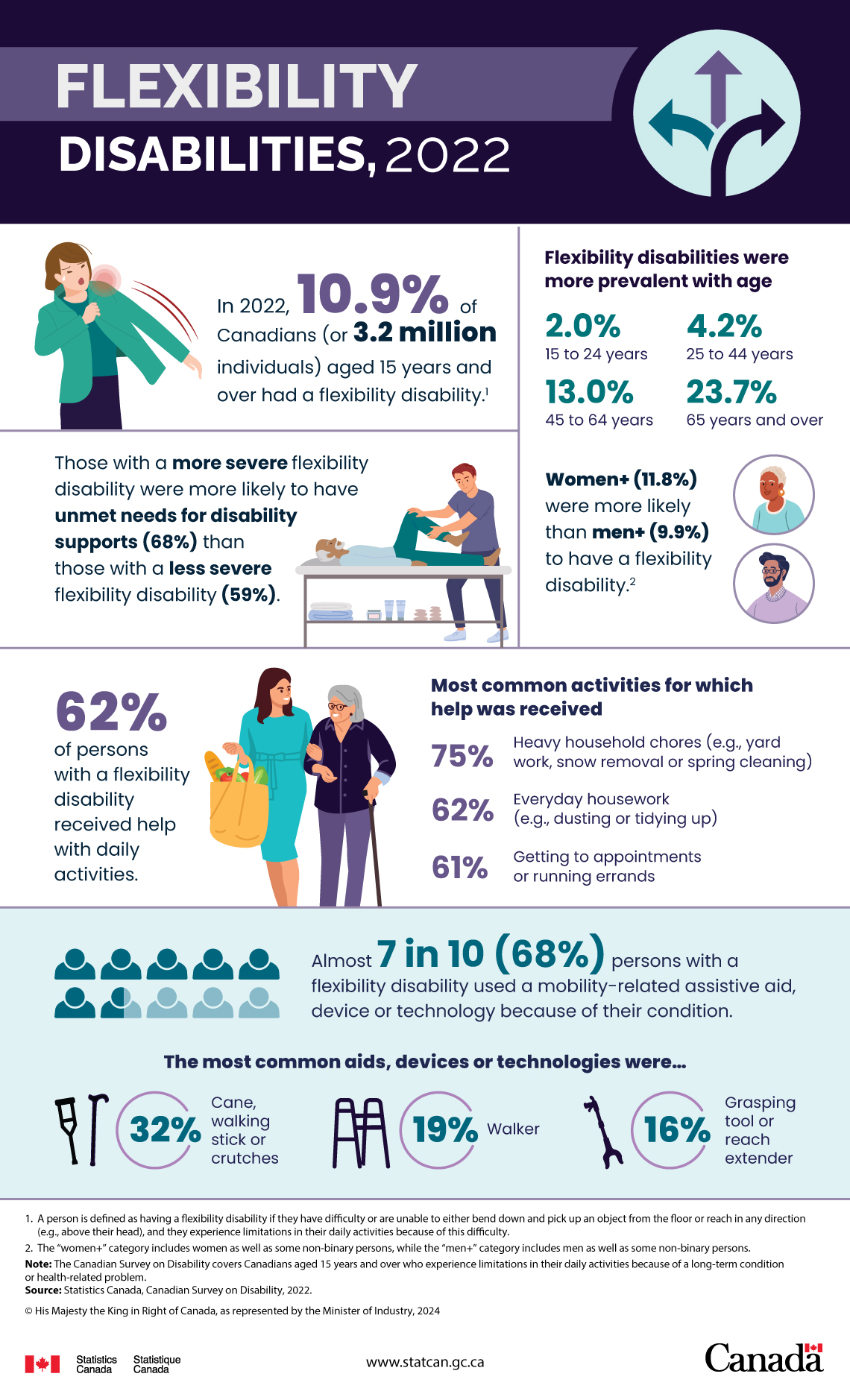 In 2022, 10.9% of Canadians (or 3.2 million individuals) aged 15 years and over had a flexibility disability.1