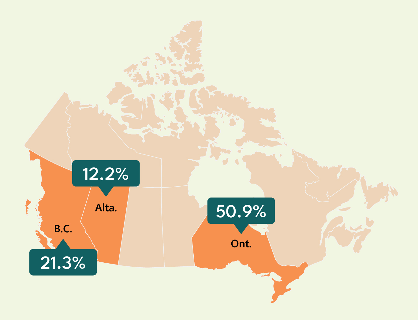 - More than half (50.9%) of the population who reported an Asian origin lived in Ontario while 21.3% lived in British Columbia and 12.2% in Alberta.
