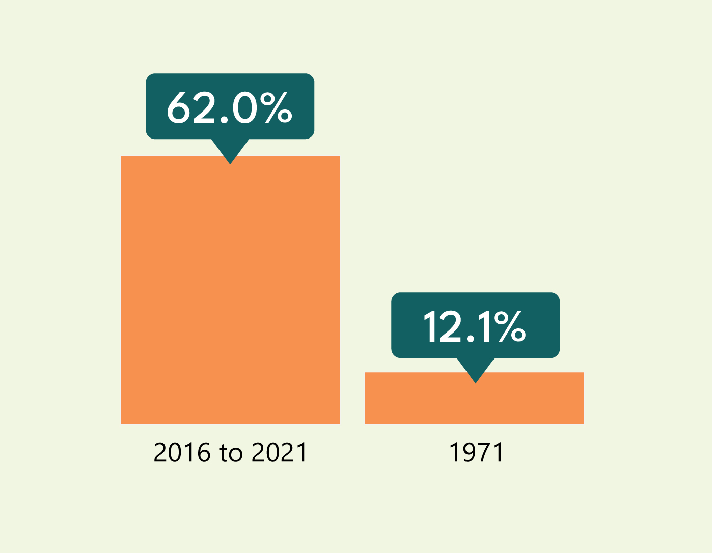 - The proportion of Asian-born among recent immigrants made up a record-high 62.0% of recent immigrants admitted from 2016 to 2021, whereas in 1971, 12.1% of recent immigrants were from Asia.