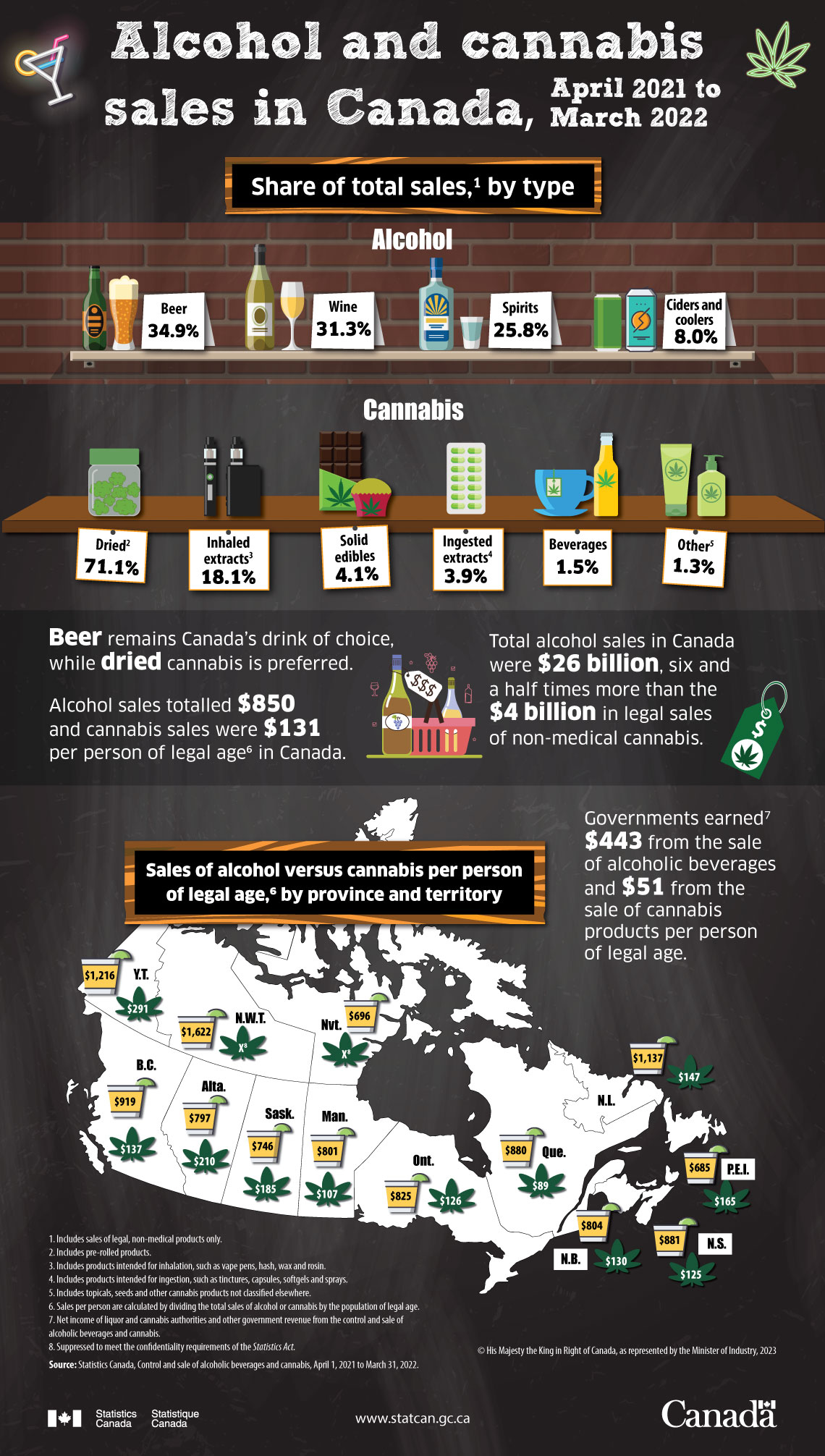This infographic presents alcohol and cannabis sales in Canada for the period from April 1, 2021, to March 31, 2022. It gives a breakdown of sales by type of alcoholic beverage and cannabis product. It also shows the revenue governments earned from the control and sale of alcoholic beverages and cannabis products.