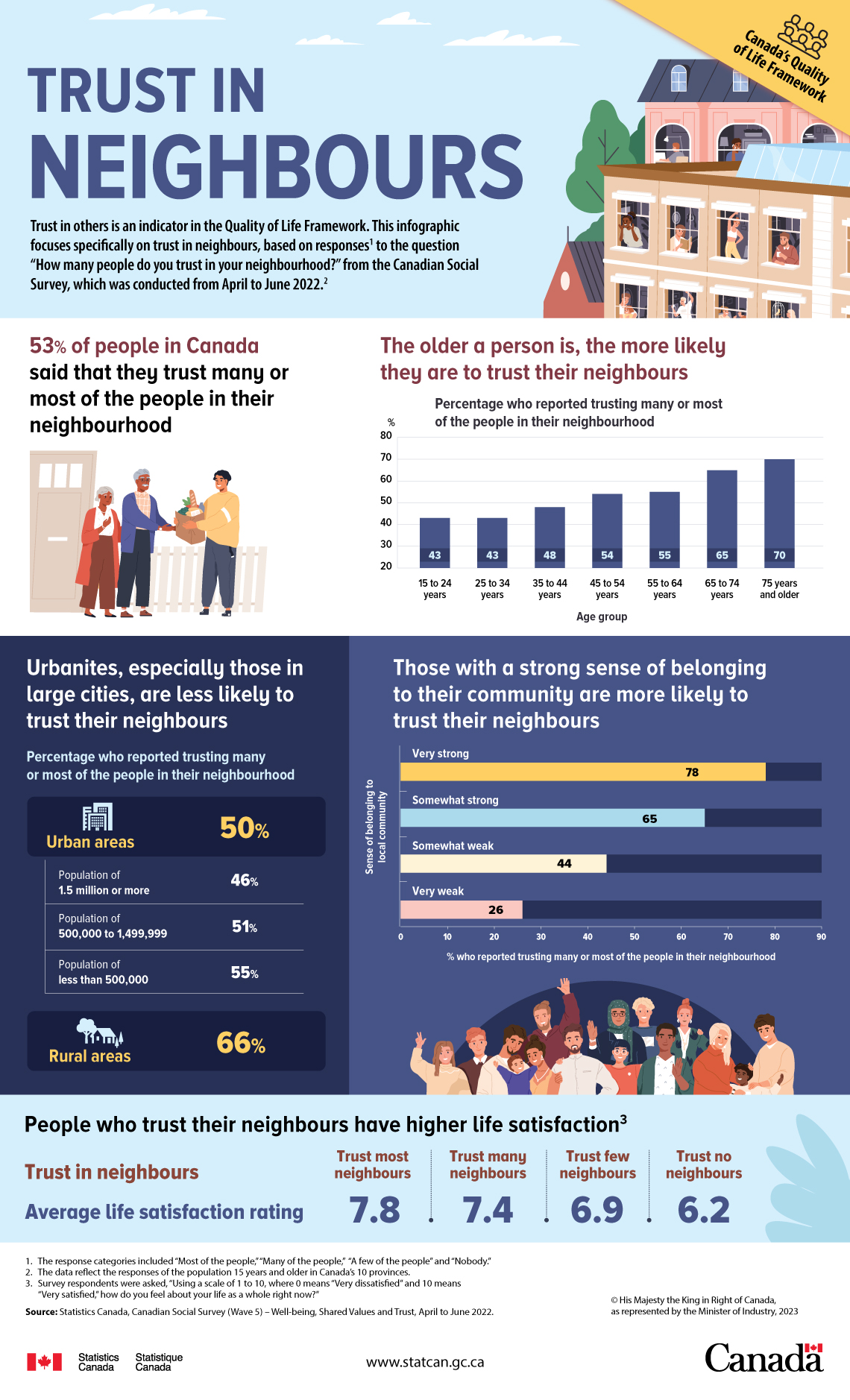 Trust in others is an indicator in the Quality of Life Framework for Canada. The data presented in this infographic were collected during wave 5 of the Canadian Social Survey, which was conducted from April to June 2022. This infographic focuses specifically on trust in neighbours, based on responses to the question “How many people do you trust in your neighbourhood?”, where the response categories included “Most of the people,” “Many of the people,” “A few of the people” and “Nobody.” Results are presented according to selected demographic characteristics, including gender and age group. This infographic also shows how Canadians’ life satisfaction and sense of belonging to their local community vary in relation to how many neighbours they trust.