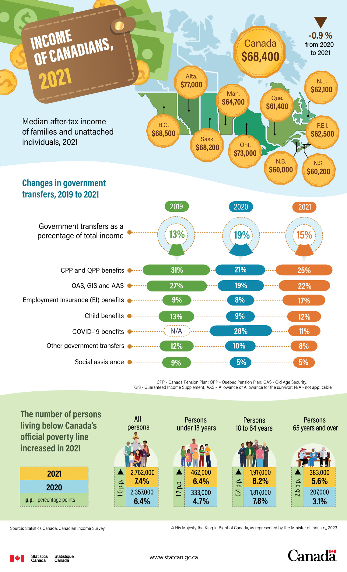 This infographic presents some highlights from the 2021 Canadian Income Survey data.