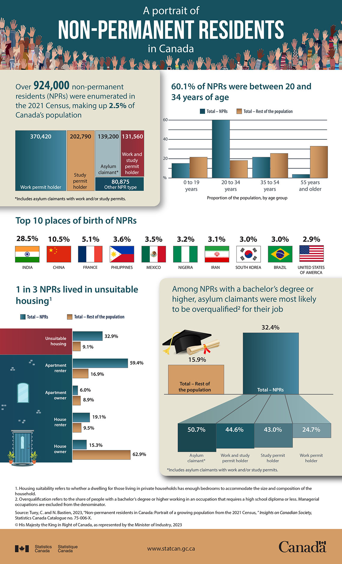 This infographic uses data from the 2021 Census of Population to provide a profile on non-permanent residents (NPRs) living in Canada. It presents various demographic and socio-economic characteristics of NPRs, and disaggregates by type of non-permanent resident. It reports on the topics of age, country of origin, labour market outcomes, and housing.