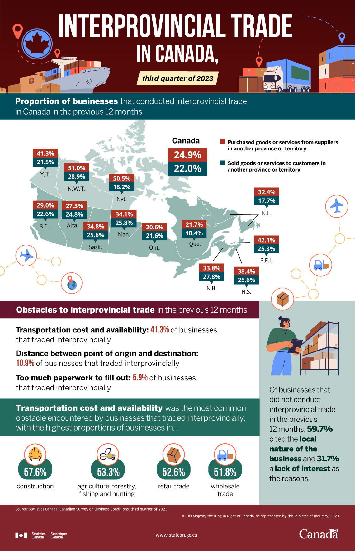 From the beginning of July to early August 2023, Statistics Canada conducted the Canadian Survey on Business Conditions to better understand the current environment that businesses in Canada are operating in and their expectations moving forward. Part of the survey collected data from businesses in Canada who sold or purchased goods or services across provincial and territorial borders and the obstacles they faced when conducting interprovincial trade. The reasons behind businesses deciding not to purchase or sell goods or services across provincial and territorial borders were also captured in this iteration. Some of the key findings are presented in this infographic.