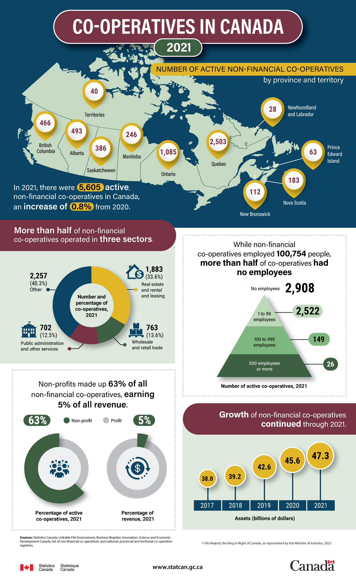 This infographic uses administrative tax data to provide a visual representation of non-financial co-operatives in Canada in 2021. Presented data includes counts of co-operatives at the national and provincial levels, as well as financial and employment statistics.