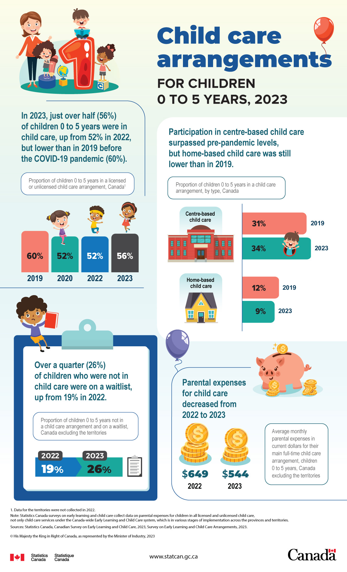 - Statistics Canada’s surveys on early learning and child care collect parental expenses for all children using licensed or unlicensed child care, not only child care that is part of the Canadian-wide Early Learning and Child Care system; which is in various stages of implementation across provinces and territories. Data for the territories were not collected in 2022.