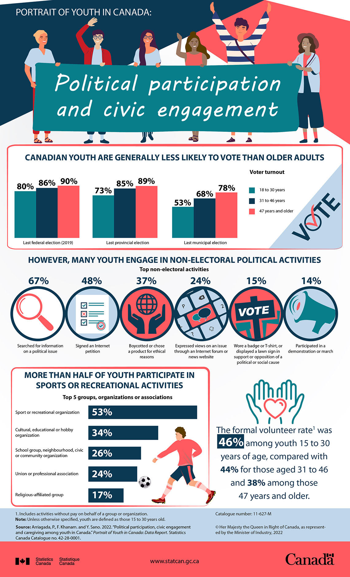 This infographic looks at political participation and civic engagement among youth in Canada. It examines their voter turnout in federal, provincial and municipal elections. It also looks at non-electoral political activities such as expressing views on the Internet, signing petitions, and participating in marches and demonstrations. Lastly, it explores other aspects of civic engagement including participating in groups, organizations and associations and volunteering. Data are drawn from the 2020 General Social Survey (GSS) on Social Identity and the 2018 GSS on Giving, Volunteering and Participating.