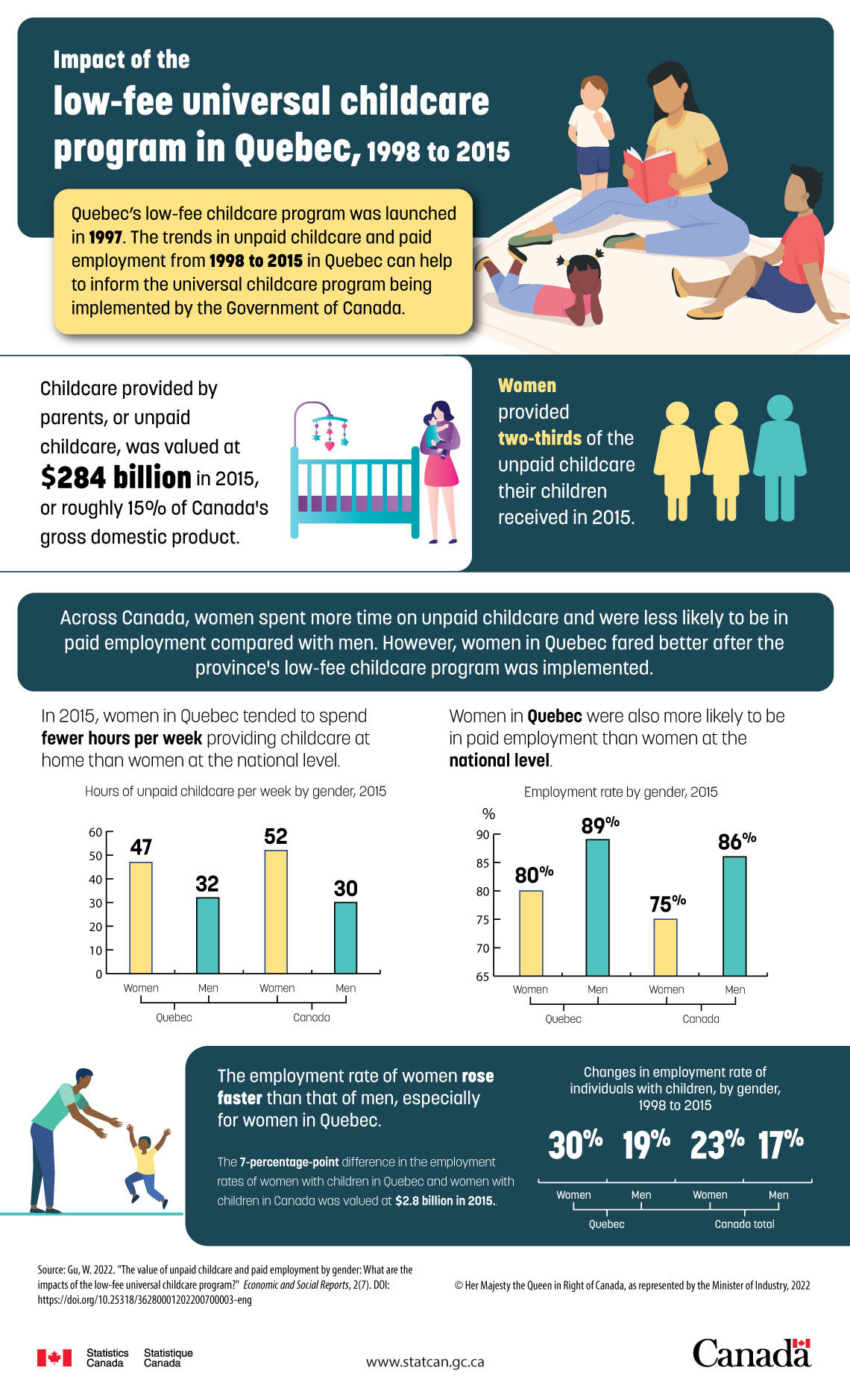 Source: Gu, W. 2022. “The value of unpaid childcare and paid employment by gender: What are the impacts of the low-fee universal childcare program?” Economic and Social Reports, 2(7). DOI: https://doi.org/10.25318/36280001202200700003-eng
