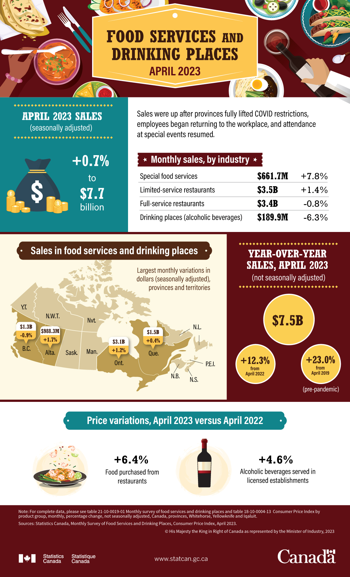 Sources: Statistics Canada, Monthly Survey of Food Services and Drinking Places, Consumer Price Index, April 2023.