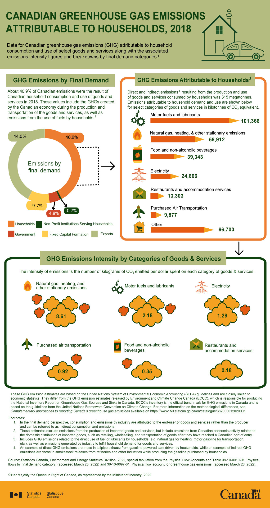 Data for Canadian greenhouse gas (GHG) emissions attributable to household consumption and use of select goods and services along with the associated emissions intensity figures and breakdowns by final demand categories.