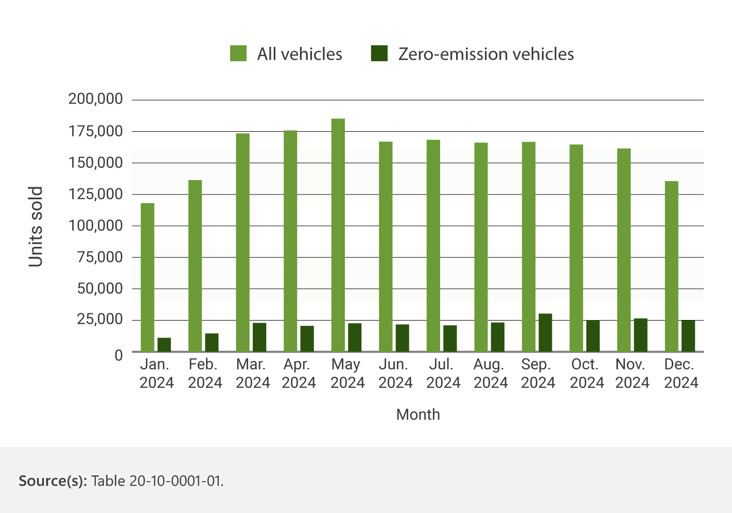 There are two bars for each month, the first bar representing all vehicles, and the second bar representing zero-emission vehicles.