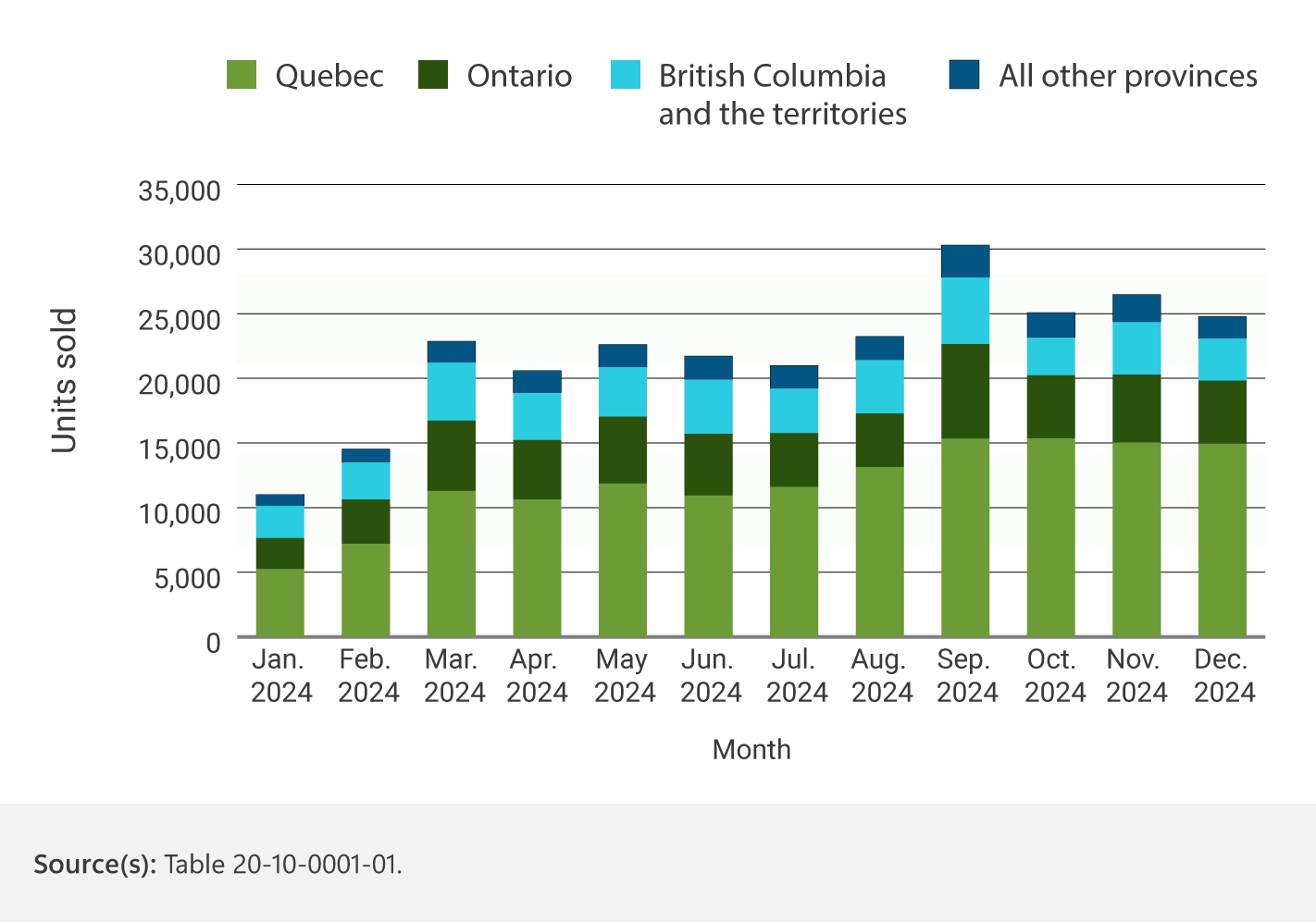 There is one bar for each month, and each bar contains four series, from bottom to top. The first series represents Quebec, the second series represents Ontario, the third series represents British Columbia and the territories, and the fourth series represents all other provinces.