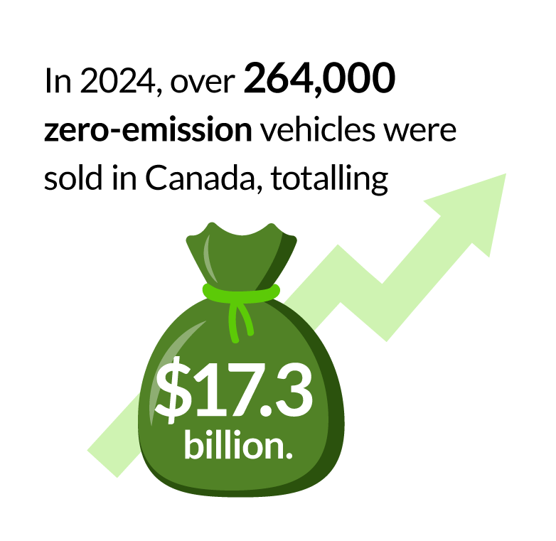 In 2024, over 264,000 ZEVs were sold in Canada, valued at $17.3 billion. Unlike overall new sales, which hit their highest point in May, ZEV sales peaked in September, with 30,318 units sold. ZEV sales were noticeably stronger in the second half of 2024, as new models hit the market. Additionally, some provincial rebates were set to be reduced in 2025, prompting a flurry of ZEV purchases as consumers rushed to take advantage of the larger rebates.