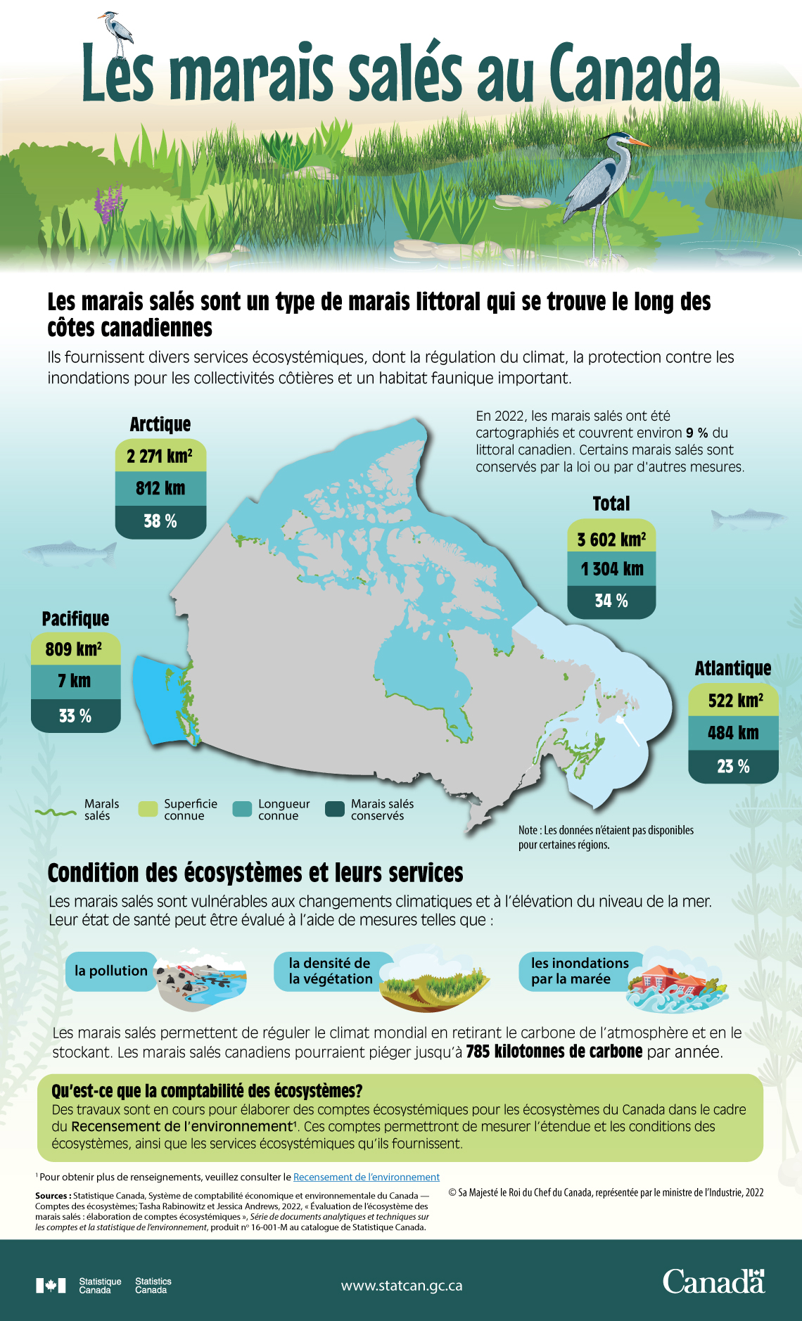 Cette infographie présente des données sélectionnées provenant des comptes écosystémiques des marais salés, qui servent de base pour l’élaboration de ces comptes et qui orienteront l’expansion des comptes des écosystèmes côtiers et océaniques dans le cadre du Recensement de l’environnement. Ces comptes permettront de mesurer l’étendue et les conditions des écosystèmes, ainsi que les services qu’ils fournissent, tout en assurant la conformité à la norme internationale de comptabilité environnementale.