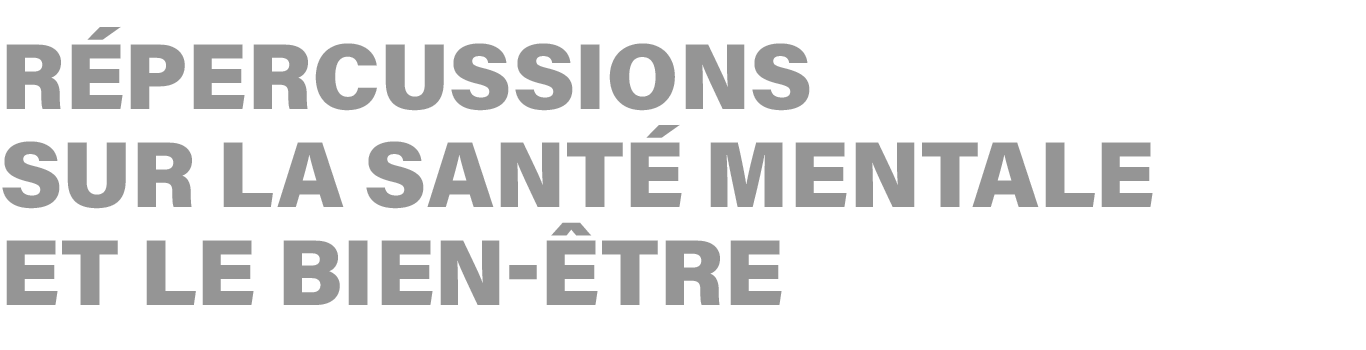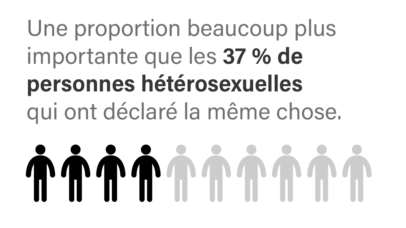 Les données de l’ESEPP montrent qu’une grande proportion des personnes LGB+ au Canada sont victimes de violence fondée sur le genre dans leur vie quotidienne; elles subissent des comportements sexuels non désirés en public et au travail, du harcèlement en ligne ainsi que des comportements manifestement plus violents, comme des agressions physiques et des agressions sexuelles. De tels comportements peuvent avoir de graves répercussions sur la santé mentale et le bien-être. Lorsqu’on leur a demandé d’autoévaluer leur santé mentale, environ le tiers (32 %) des personnes LGB+ de 15 ans et plus au Canada ont déclaré que leur santé mentale était mauvaise ou passable. Plus précisément, un peu plus de 4 personnes bisexuelles sur 10 (41 %) et 1 personne gaie ou lesbienne sur 5 (20 %) au Canada ont déclaré avoir une santé mentale mauvaise ou passable. À titre de comparaison, un peu plus de 1 personne hétérosexuelle sur 10 (11 %) au Canada a déclaré avoir une santé mentale mauvaise ou passable.