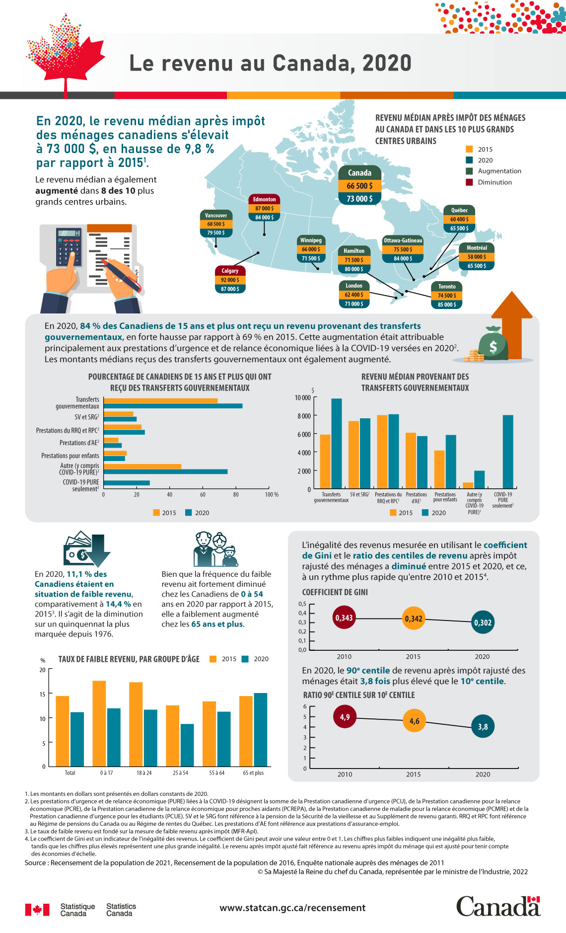 En 2020, le revenu médian après impôt des ménages canadiens s'élevait à 73 000 $, en hausse de 9,8 % par rapport à 2015.