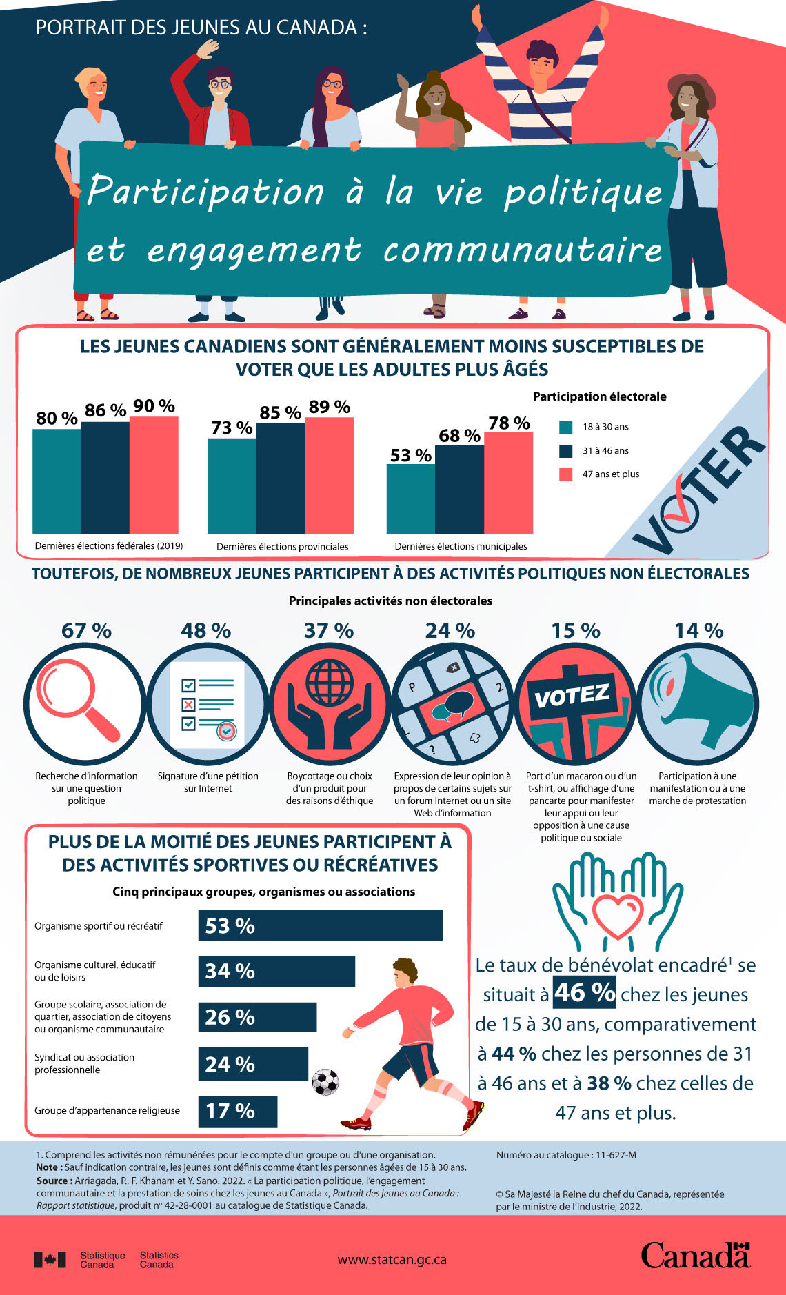 Source : Arriagada, P., F. Khanam et Y. Sano. 2022. « La participation politique, l’engagement communautaire et la prestation de soins chez les jeunes au Canada », Portrait des jeunes au Canada : Rapport statistique, produit no 42-28-0001 au catalogue de Statistique Canada.
