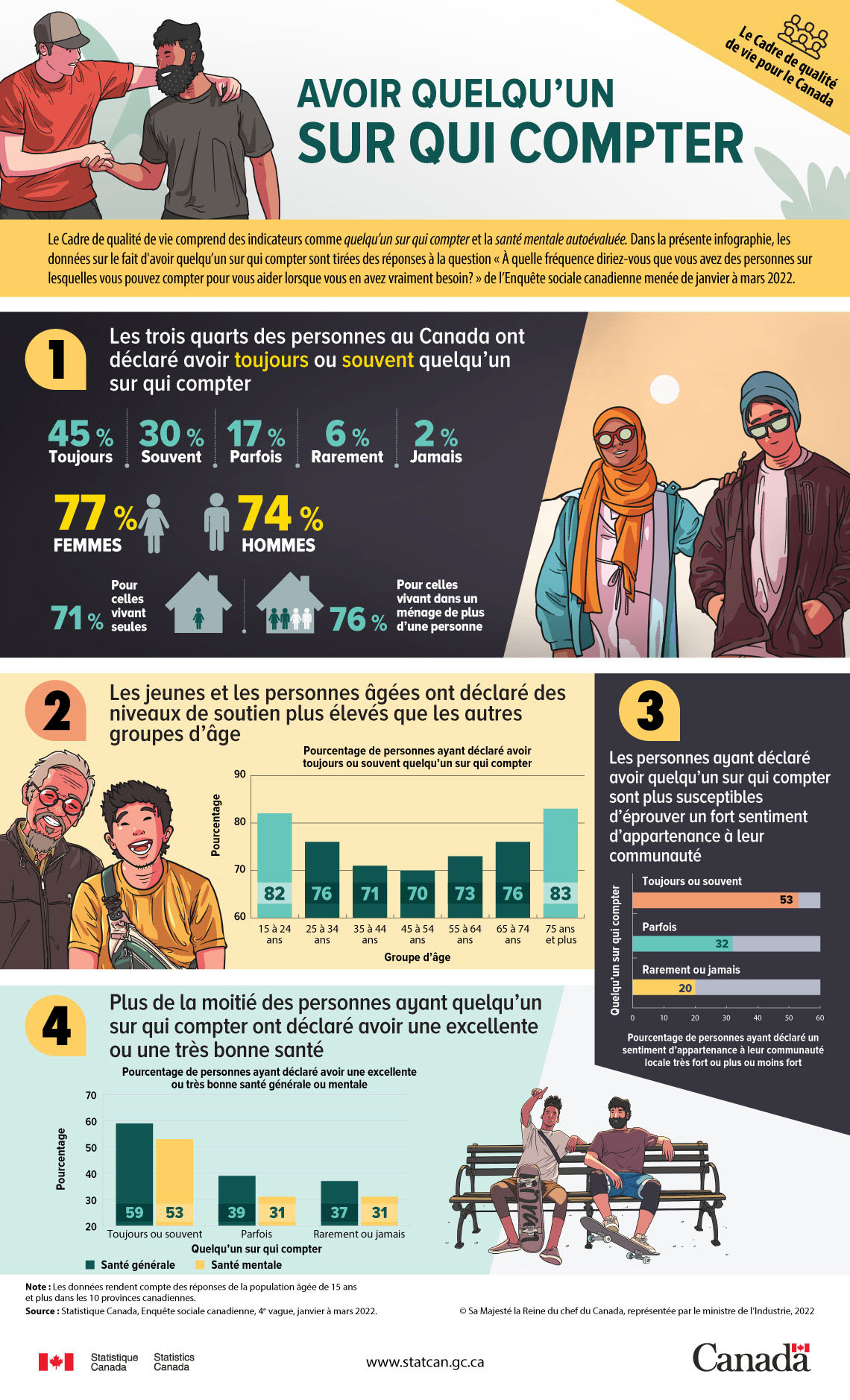 Cette infographie présente des données sur les personnes au Canada qui ont quelqu'un sur qui compter. Les données, recueillies de janvier à mars 2022, proviennent des réponses à la question suivante : " À quelle fréquence diriez-vous que vous pouvez compter sur des personnes pour vous aider lorsque vous en avez vraiment besoin? " de l'Enquête sociale canadienne. Les résultats sont présentés selon certaines caractéristiques démographiques, y compris le genre et le groupe d'âge. L'infographie montre également de quelle manière le sentiment d'appartenance des Canadiens et des Canadiennes à leur collectivité locale, leur santé autoévaluée et leur santé mentale autoévaluée varient selon la fréquence à laquelle ces personnes déclarent avoir quelqu'un sur qui compter. Quelqu'un sur qui compter est un indicateur du Cadre de qualité de vie pour le Canada.