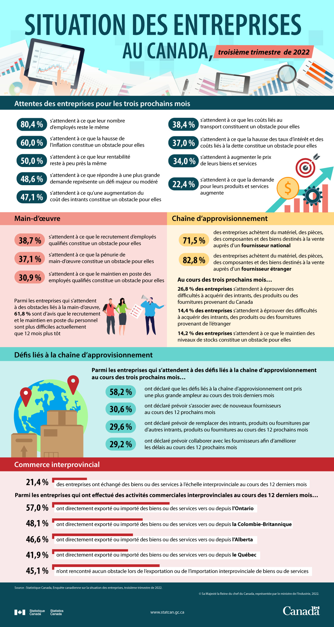 Du 4 juillet au 8 août 2022, Statistique Canada a réalisé l'Enquête canadienne sur la situation des entreprises. L'objectif de cette enquête est de recueillir de l'information sur les entreprises au Canada en lien avec de nouveaux enjeux. Cette infographie présente certains des principaux résultats de l'enquête.