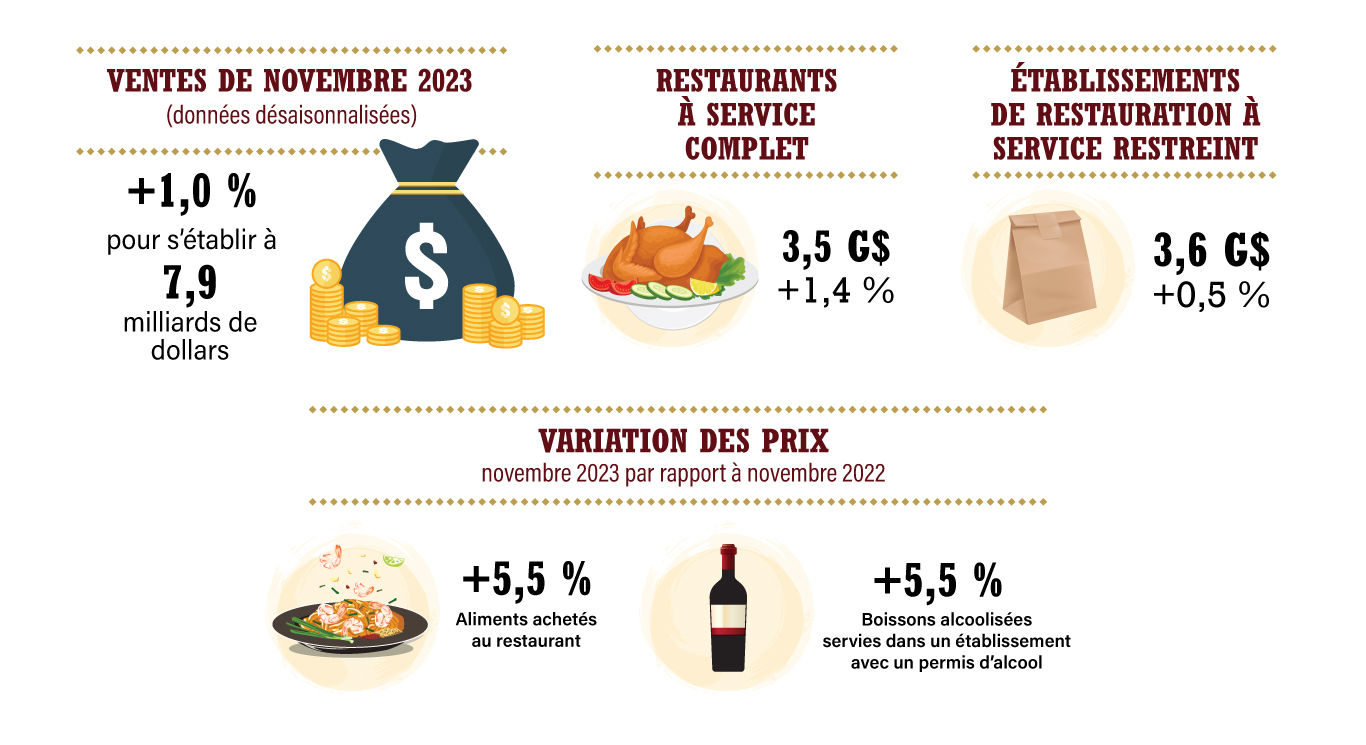 Les ventes dans les services de restauration et les débits de boissons ont augmenté de 1,0 % pour atteindre 7,9 milliards de dollars en novembre (données désaisonnalisées).
