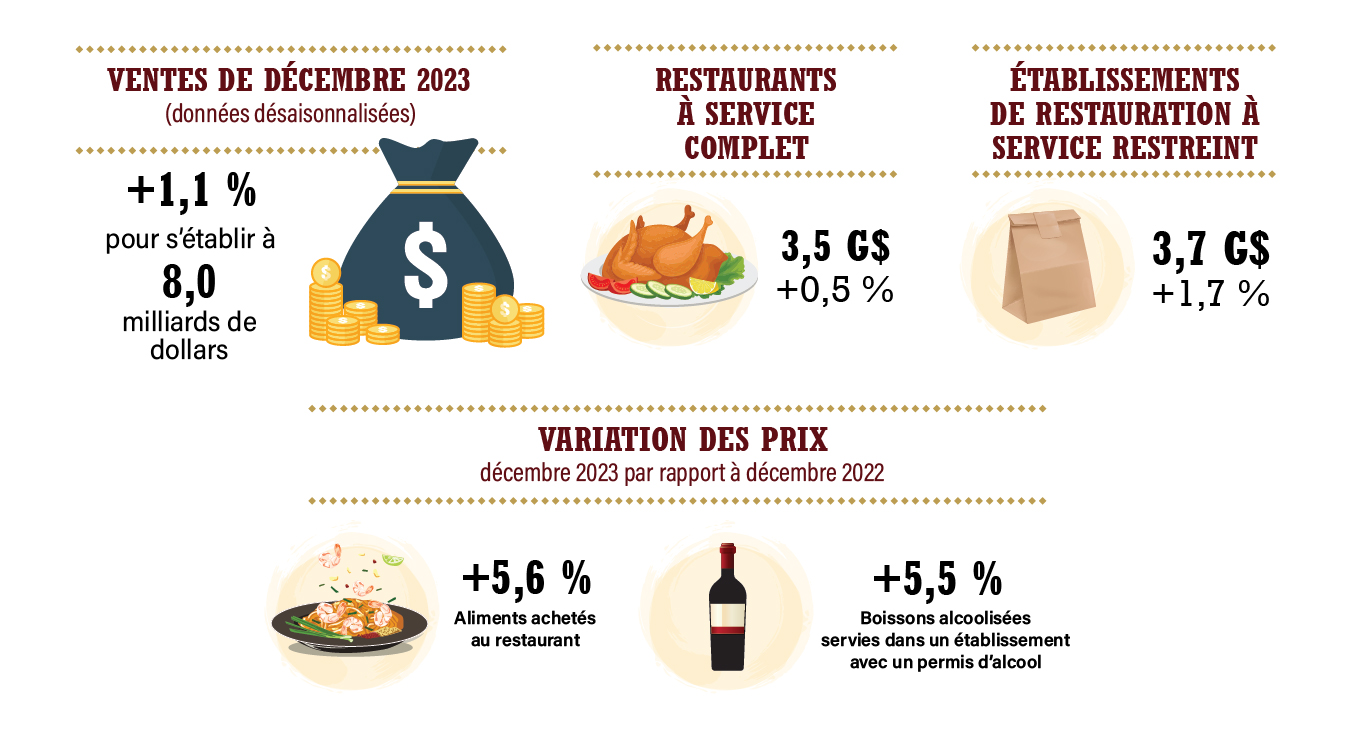 Les ventes des services de restauration et des débits de boissons ont augmenté de 1,1 % pour s’établir à 8,0 milliards de dollars en décembre 2023 (données désaisonnalisées). Les ventes ont augmenté dans les établissements de restauration à service restreint (+1,7 %), les restaurants à service complet (+0,5 %), les services de restauration spéciaux (+0,9 %) et les débits de boissons (+2,7 %).