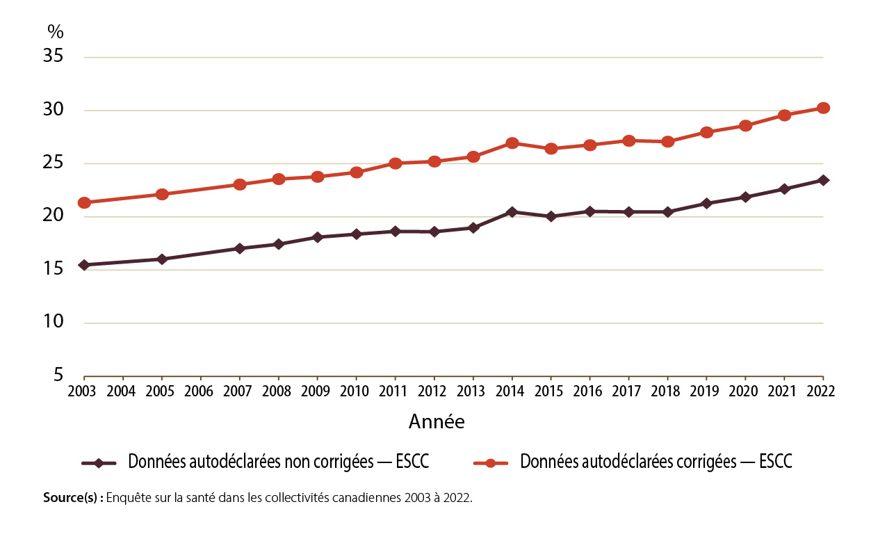 Des recherches laissent entendre que la prévalence de l’obésité au Canada a augmenté au cours des 20 dernières années. Les données sur le poids et la taille autodéclarées dans le cadre de l’Enquête sur la santé dans les collectivités canadiennes de 2022 révèlent que près de 1 Canadien âgé de 18 ans et plus sur 3 (30 %) était obèse en 2022, en hausse par rapport à un peu plus de 1 sur 5 (21 %) en 2003.