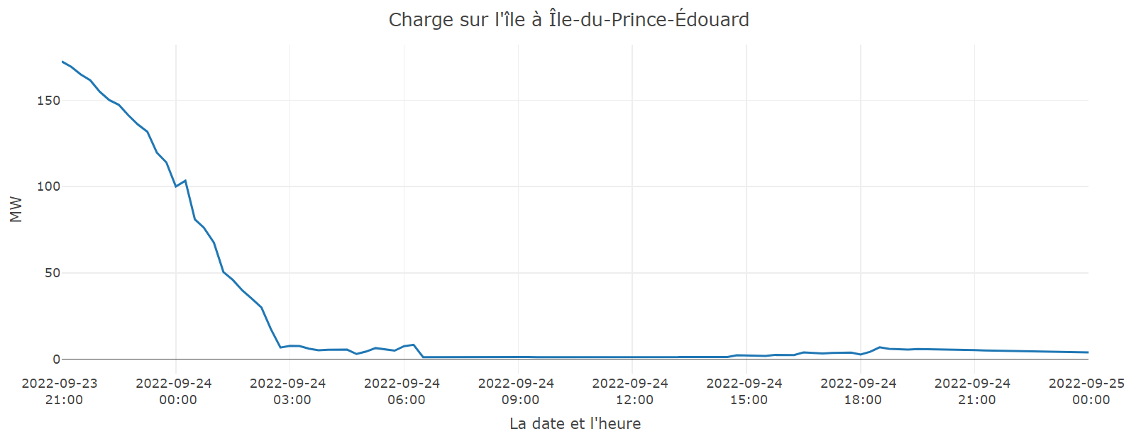 Au moment où l’ouragan Fiona s’est rapproché de l’Île-du-Prince-Édouard très tôt le 24 septembre 2022, la charge sur l’île a été divisée par cent environ, passant d’à peu près 100 MW à minuit à un peu plus de 1,23 MW à 6 h 30. En raison des nombreuses pannes de courant, la charge a stagné et ne se situait qu’à 3,94 MW à minuit le 25 septembre.