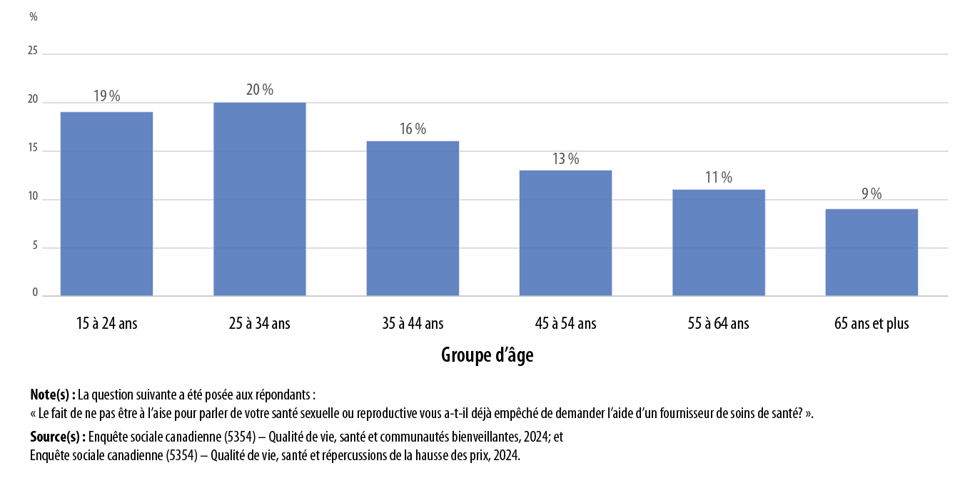 Les jeunes étaient plus susceptibles que les personnes de groupes d’âge plus avancés de déclarer qu’un inconfort à parler de leur santé sexuelle ou reproductive les avait déjà empêchés d’obtenir l’aide d’un fournisseur de soins de santé (graphique 2). Environ 1 personne sur 5 de 15 à 24 ans (19 %) et de 25 à 34 ans (20 %) a déclaré qu’un inconfort à parler de sa santé sexuelle ou reproductive l’avait déjà empêchée d’obtenir l’aide d’un fournisseur de soins de santé, comparativement à 9 % des Canadiens de 65 ans et plus.