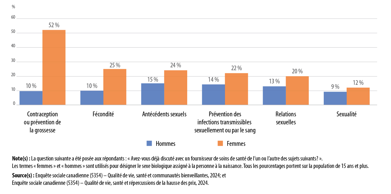 Note(s) : La question suivante a été posée aux répondants : « Avez-vous déjà discuté avec un fournisseur de soins de santé de l’un ou l’autre des sujets suivants? ». Les termes « femmes » et « hommes » sont utilisés pour désigner le sexe biologique assigné à la personne à la naissance. Tous les pourcentages correspondent à la population de 15 ans et plus.