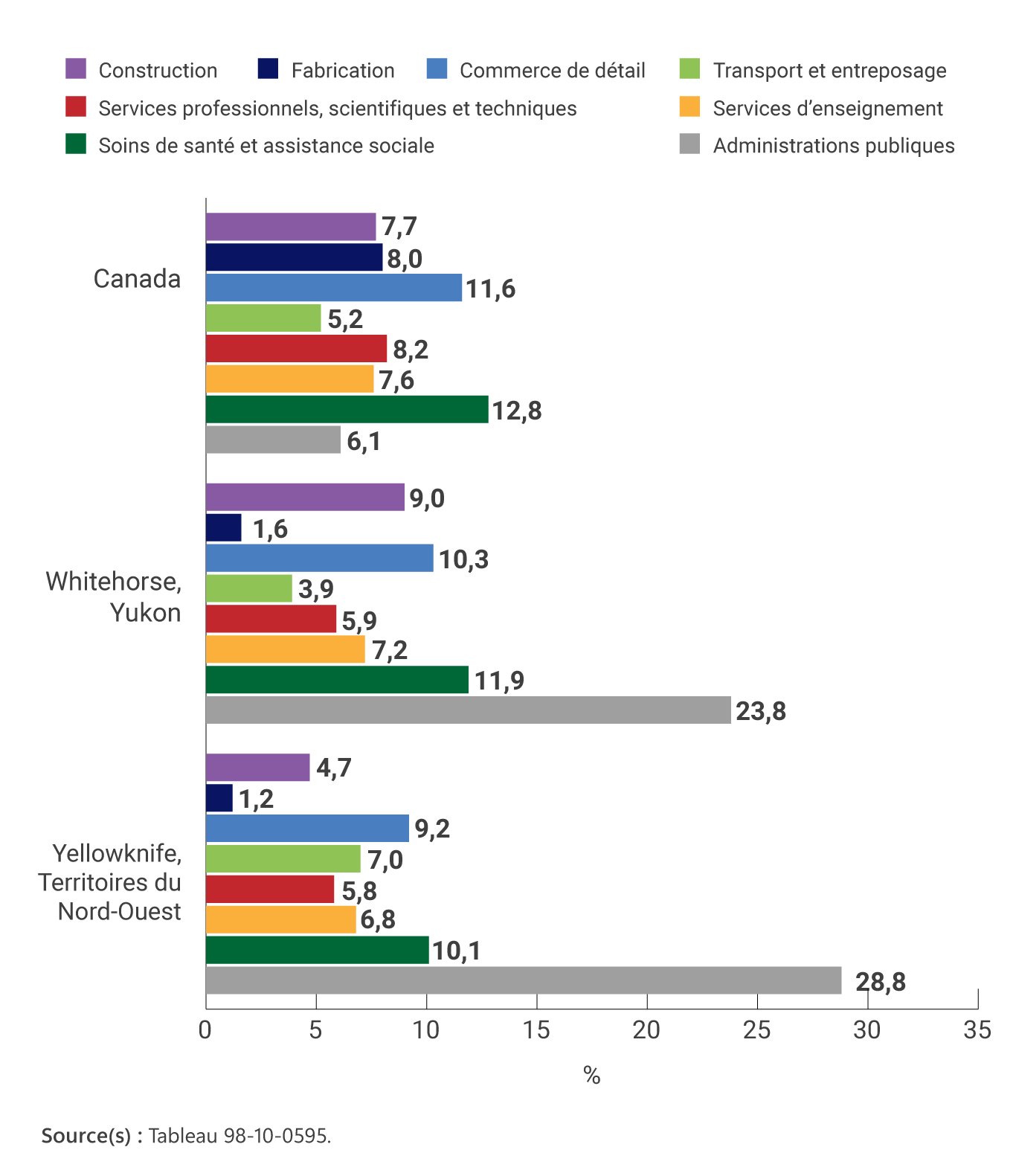 L’axe vertical montre trois groupes de huit barres. Les huit barres, de haut en bas, représentent les secteurs de la construction, de la fabrication, du commerce de détail, du transport et de l’entreposage, des services professionnels, scientifiques et techniques, des services d’enseignement, des soins de santé et de l’assistance sociale, et des administrations publiques. Chaque groupe de barres représente, de haut en bas, le Canada, la ville de Whitehorse au Yukon et la ville de Yellowknife dans les Territoires du Nord-Ouest.