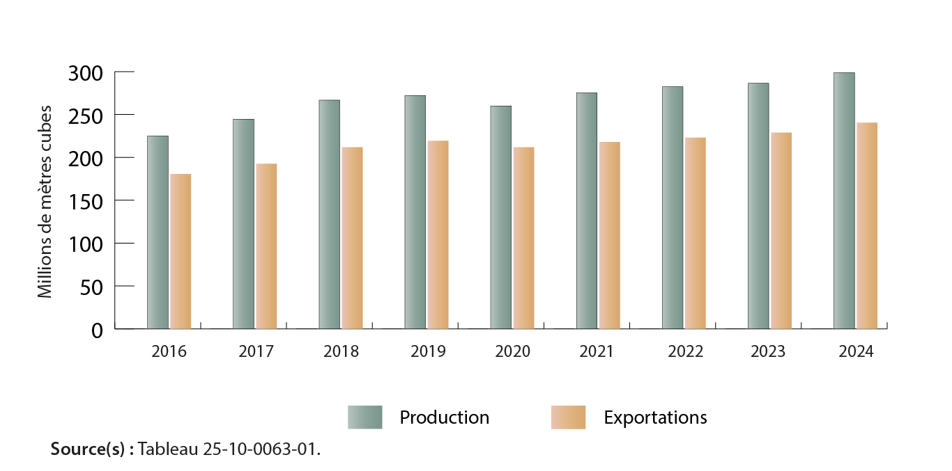 En 2024, la croissance globale était principalement attribuable au secteur des sables bitumineux, les activités d’entretien ayant amélioré l’efficacité de certains sites de valorisation et de production de bitume. À la suite de travaux d’entretien réalisés au début de l’automne, la production tirée des sables bitumineux a atteint un nouveau record mensuel de 17,8 millions de mètres cubes en décembre. La production de pétrole brut synthétique a augmenté de 4,3 % pour atteindre 74,0 millions de mètres cubes en 2024, tandis que la production de bitume brut non valorisé a augmenté au même rythme (+4,3 %) pour atteindre 121,5 millions de mètres cubes.